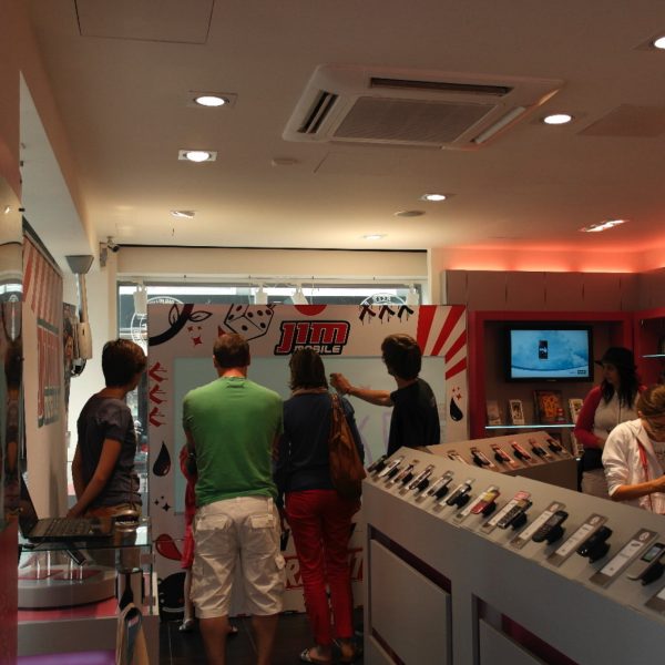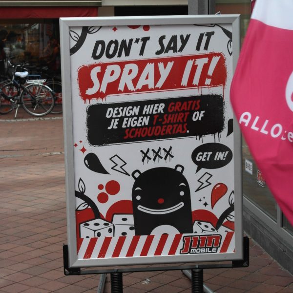 « Don’t say it, spray it ! ». C’est avec ce slogan que les clients déambulant dans les rues commerçantes sont invités à entrer dans les magasins d’ALLO telecom lors du Roadshow de Jim Mobile. Pour l’occasion, il est fait appel à l’Yrwall, le panneau numérique de graffiti de Fast Forward.